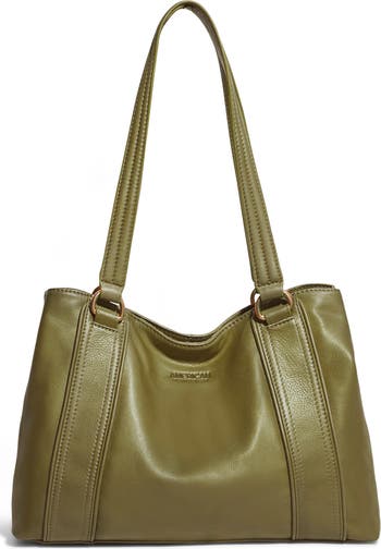 Love this handbag. Leather is extremely soft. Purse has ample pockets and zippered sections. It's big enough to hold my tablet and phone for traveling. Very pleased with this purchase.