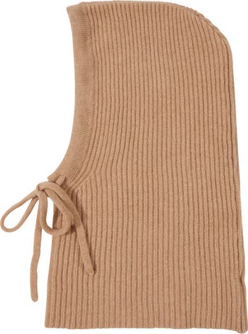 Keep your head toasty warm in this ribbed hood that features an adjustable drawstring and is knit from cashmere yarns.