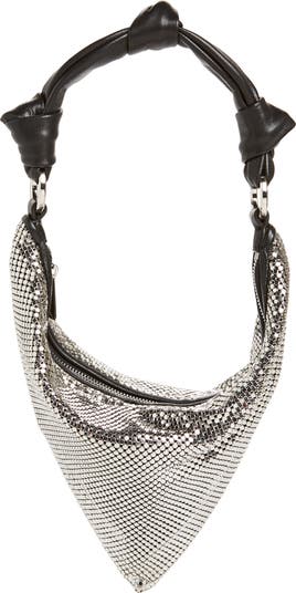 A slouchy scarf-inspired silhouette crafted of shimmery metal defines this event-ready mini hobo bag topped with a knotted lambskin-leather strap.