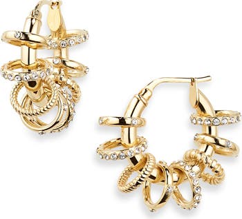 These golden hoop earrings are threaded with an array of securely fastened mini rings sparked in crystal.