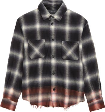 A ragged hem and ombré-plaid patterning lend a grunge-inspired element to a kid-sized cotton-blend flannel boasting logo embroidery at the back.
