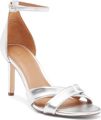 Crisscrossing straps define the vamp of a party-ready sandal lofted by a slender stiletto heel that always makes a statement.