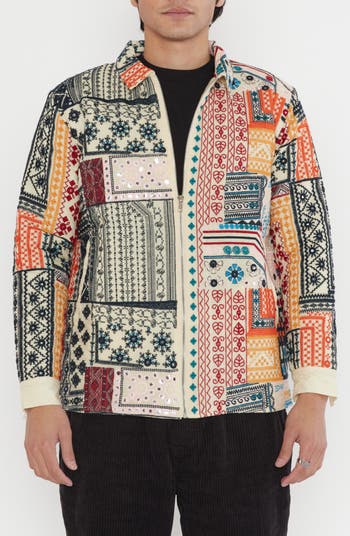 Drawing from Indian heritage and laid-back Venice Beach vibes, Raga Man brings boho style into cooler weather with this colorful cotton jacket in an elaborately embroidered patchwork winked with silvery paillettes.