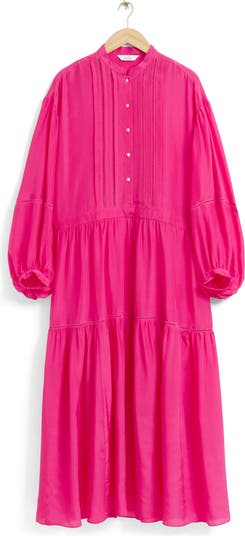 Show off a pretty pop of color in this flowy tiered maxi dress framed by inset ladder trim and billowy sleeves for chic boho style.