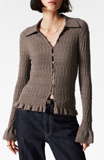 Textured stitching and ruffled cuffs play up the retro vibes of this lightweight cardigan in a slim fit.