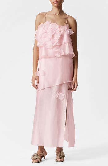 Tiered ruffles and dimensional floral appliqués add an abundance of whimsy to this gauzy pastel dress.