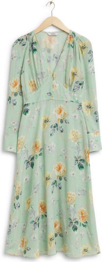 Vintage-inspired charm abounds in this gorgeous floral-print dress tailored with puffed shoulders and buttons highlighting the gathered, deep V-cut neckline. The fitted waist leads way to a floaty skirt that will gently flutter in the breeze.