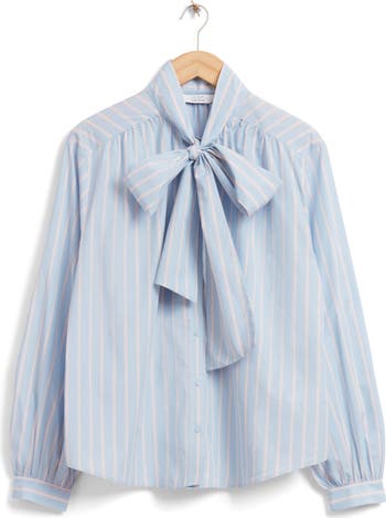 A large bow that ties at the neck adds a dose of polish to this striped, long-sleeve button-up top.