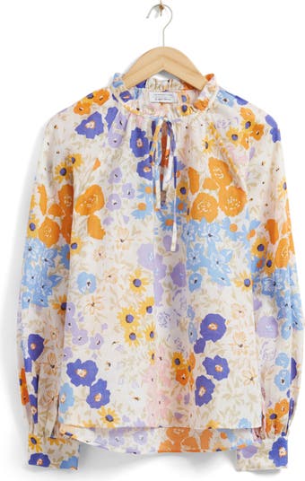 Colorful blooms pattern allover this flowy top styled with a ruffled tie neckline and billowy sleeves that's perfect for your next weekend outing.