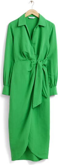 A tied waist at the left gently shapes this long-sleeved dress cut from linen-kissed fabric in an emerald hue.