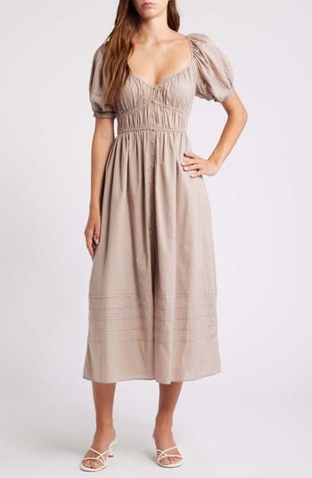 Prairie style tames a cotton dress designed with joyful puffed sleeves and pretty pleated accents.