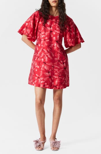 Decadent puff sleeves sweeten the silhouette of this charming leggy length dress cut from hammered satin.