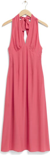 Head off to your next weekend brunch in this breezy dress styled with a plunging halter neckline and cutaway shoulders.