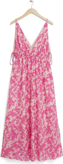 Go pretty in pink with this sleeveless A-line sundress flaunting a flirty plunge neck and an Empire waist framed by cinching side drawstring ties.