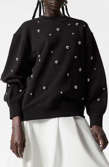 Shiny studs bring an edgy-glam attitude to an oversized cotton sweatshirt that doesn't belong at the gym.