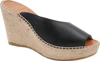 An asymmetric topline lends modern dimension to an espadrille-inspired sandal lifted by a jute-wrapped platform and wedge heel.