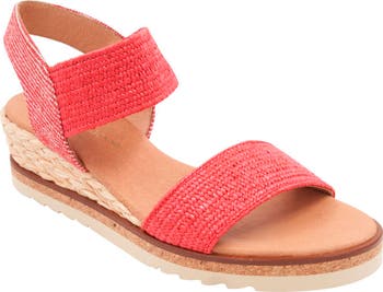 Stretchy raffia straps ensure a comfortable, flexible fit in this espadrille-inspired wedge sandal featuring a cushioned footbed that offers lasting comfort.