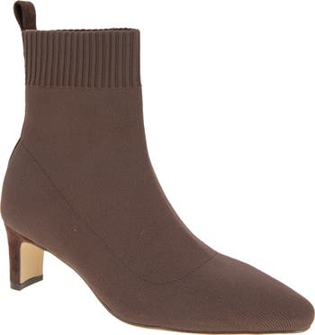 A durable pull-tab anchors the heel counter of a knit bootie framed by a plain toe and rectangular block heel.