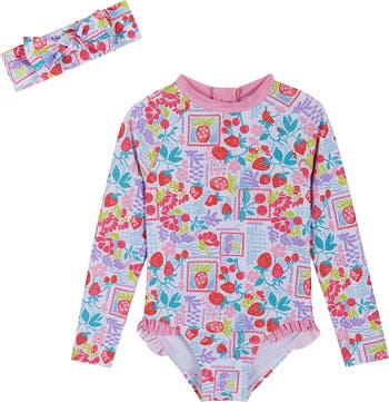 A sweet fruit print adds a splash of color to this long-sleeve one-piece rashguard and headband set that'll keep your little one protected from the sun.