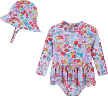 A skirted one-piece rashguard and matching hat keep baby protected from harsh rays as they splash and play along the surf and sand.