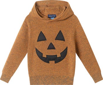 A grinning appliquéd Jack o' Lantern brings Halloween joy to a sweater-hoodie knit from marled yarns in harvest hues.