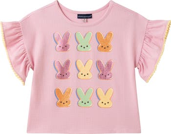 Your little bunny-boo will look adorned in this softly ribbed rabbit graphic T-shirt finished with pompom-trimmed flutter sleeves.