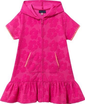 Sunny adventures and splash-filled days call for this tot-and kid-approved hooded cover-up dress decorated with tropical flowers and finished with frilly trim.