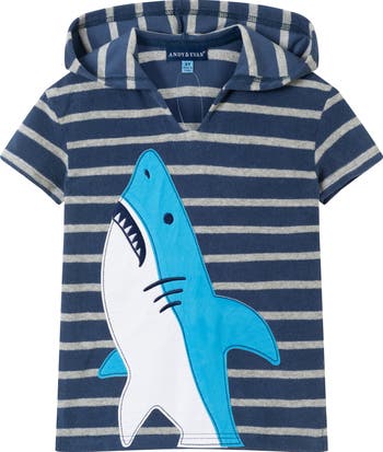 Let your kiddo rest after splashing and playing by the water in this hooded cover-up made of soft cotton-blend French terry with a cool shark breaking through a sea of stripes.