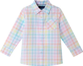Crisp cotton patterned in a colorful pastel check makes a warm-weather favorite of a shirt that's sized for kids and designed to brighten any time-to-look-nice outfit.