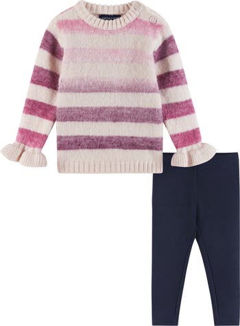 Your darling will look adorable in this sweet outfit that pairs an ombré stripe ruffle-trimmed sweater with coordinating leggings.
