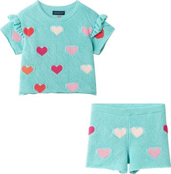 Airy openwork stitching defines the top and shorts in this matching set knit from pure cotton yarn for a comfy fit on warm-weather days.