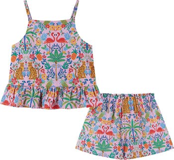 Your little one will be ready to soak up the sun in this cotton set pairing a peplum tank with shorts covered in a tropical safari motif.