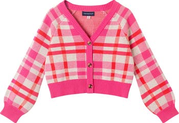 Tortoise buttons frame this V-neck cardigan in a plaid pattern from cotton yarns.