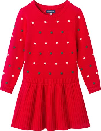 Cotton knit meets playful charm in this sweater dress styled with colorful pompoms.