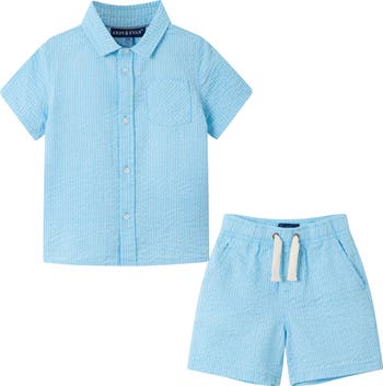 A seersucker texture gives depth and dimension to this matching set cut from an airy cotton blend.