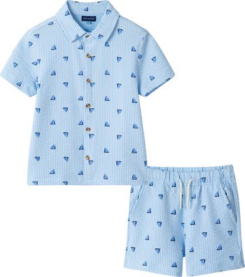 A gauzy texture lends depth and detail to a patterned shirt and shorts set made from a breezy cotton blend to make it a top choice for warm-weather outings.