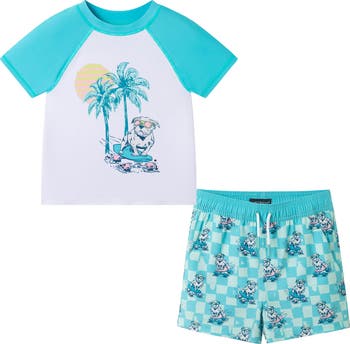 Spunky graphics lend cool-kid attitude to a T-shirt and swim shorts set that are sure to be first choice for beach-filled weekends.