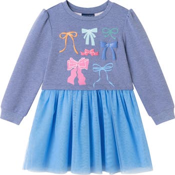 Colorful bow graphics adorn this sweatshirt dress complete with a twirl-worthy tulle skirt.