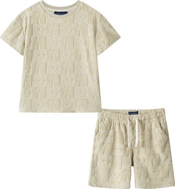 This T-shirt and shorts set keeps them comfortable all day with soft terry fabric woven in a palm tree woven pattern.
