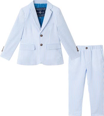 Have your dapper kid ready for any occasion with this charming suit in their rotation featuring a two-button front jacket and coordinating trousers woven from comfortable cotton.