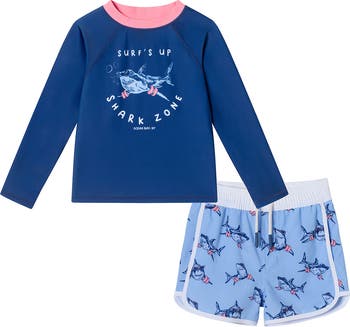 Watch your mini surfer make waves in this cute little two-piece with a solid long-sleeve rashguard top and coordinating swim trunks.