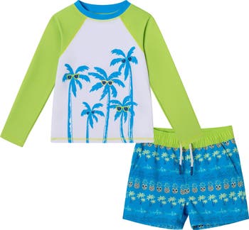 Watch your mini surfer make waves in this cute little two-piece with a solid long-sleeve rashguard top and coordinating swim trunks.
