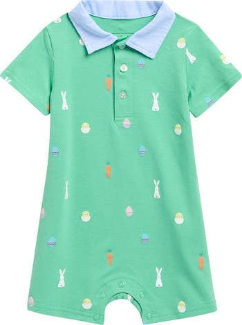 Baby will be ready to hunt for Easter eggs and enjoy the springtime season in a patterned romper made from stretch-enhanced cotton.