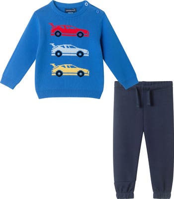 Baby will be delighted by the racecar graphics on the crewneck sweater in this easygoing set complete with coordinating joggers.