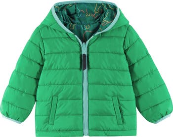 Keep your little one cozy in this reversible hooded puffer jacket featuring an adorable bear print and a solid side for two looks in one.