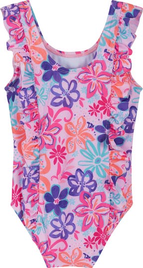 Baby can splash and play in a one-piece swimsuit designed with plenty of stretch for comfort in every movement.