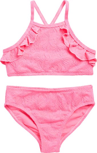 Tonal blooms and frilly ruffled trim lend kid-approved charm to a two-piece bikini that your beach-loving kiddo will love to swim and lounge in.