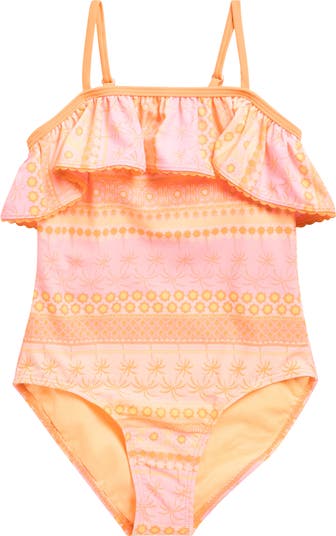 Your beach-loving kiddo will enjoy a day spent on the sand and surf in this stylish one-piece swimsuit covered in a tropical print and defined by a fun ruffled popover.