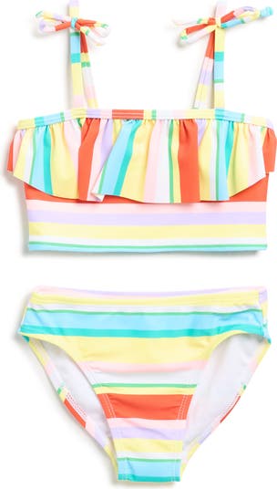 A bouncy ruffle trim and bow-tied shoulder straps frame the longline top of a bright and colorful two-piece swimsuit made for fun in the sun.