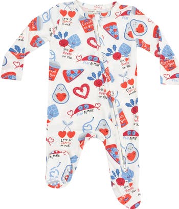 Old-school Valentine puns pepper a stretch-enhanced jersey footie made with a two-way zipper to make diaper changes a little easier.